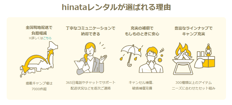 高品質なアイテムと手厚いサポートで、あなたのキャンプデビューを応援するhinataレンタルを、ぜひこの機会にご利用ください。